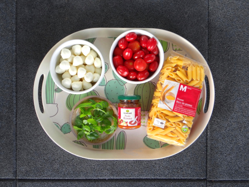 - Abgekühlte Nudeln mit Tomaten, Mozzarella, Basilikum und Pesto mischen.