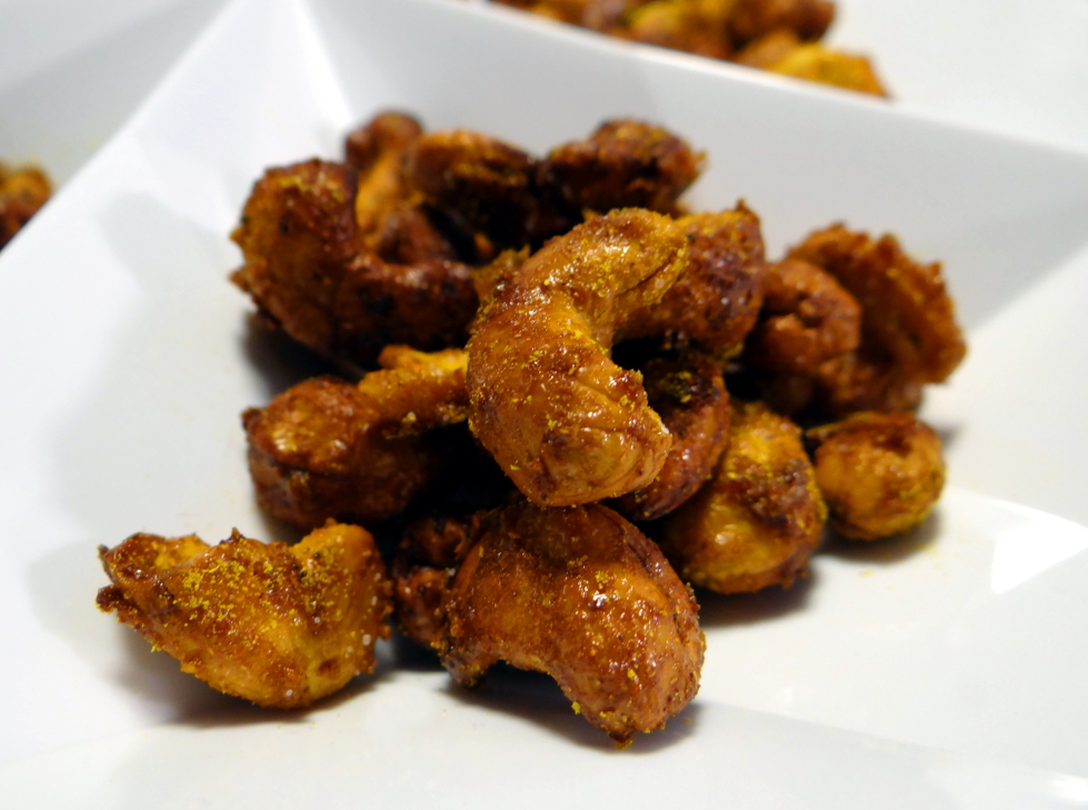 - Die Curry-Nüsse gleichmässig auf einem mit Backpapier belegten Blech verteilen und in der Mitte des Backofens ca. 5 Minuten rösten. Vorsicht, dass die Nüsse nicht schwarz werden!