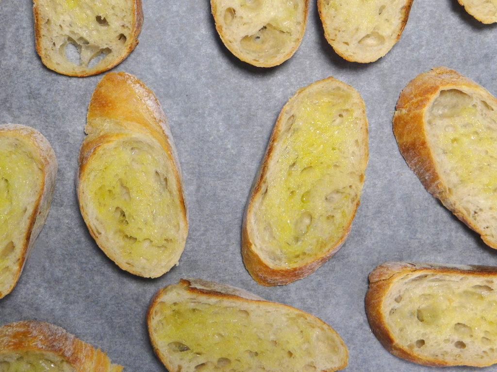 - Das Brot in Scheiben schneiden und mit etwas Olivenöl beträufeln. Dann das Brot bei 180°C für ca. 5 Minuten im Ofen rösten.
