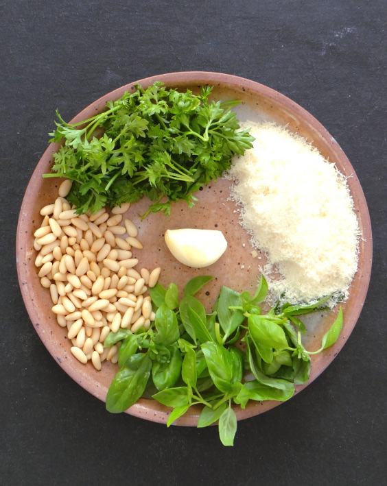 - Basilikum und Petersilie waschen und in ein hohes Gefäss geben.