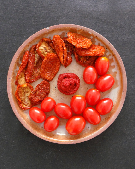 - Getrocknete Tomaten, Tomatenmark, Parmesan, Olivenöl, Zitronensaft, Salz und Pfeffer dazugeben.