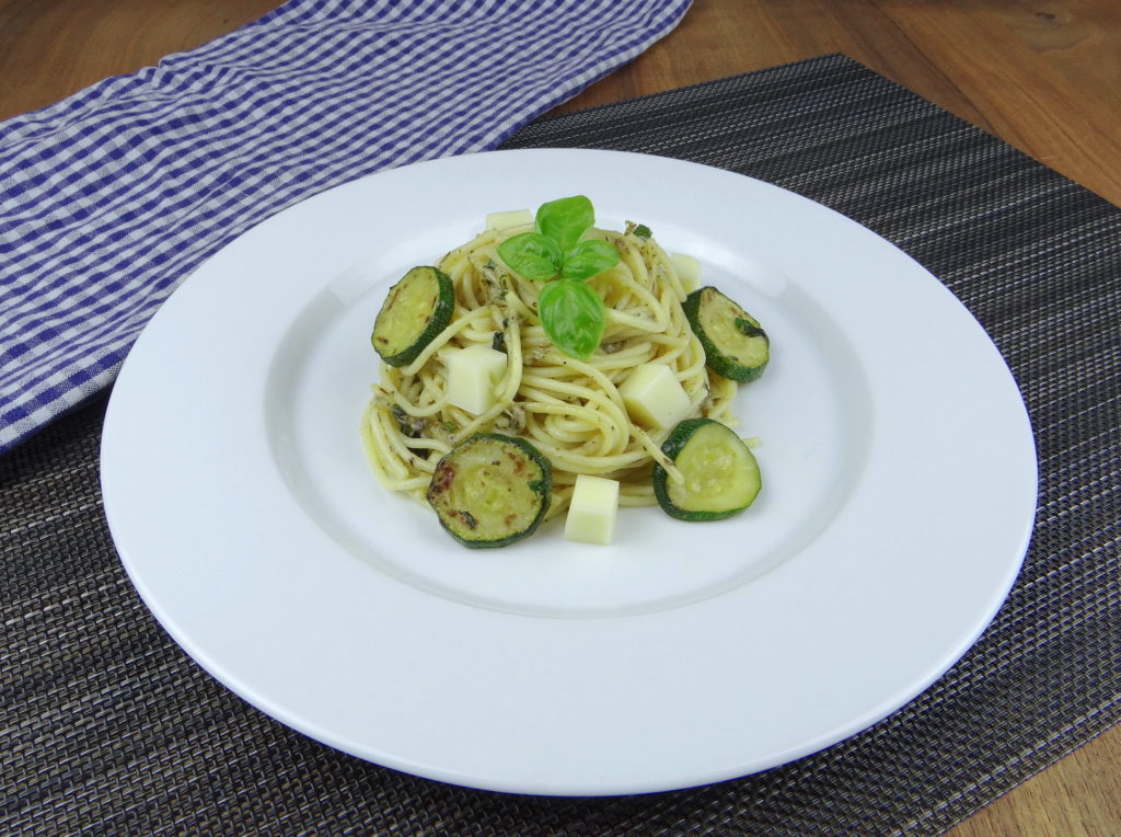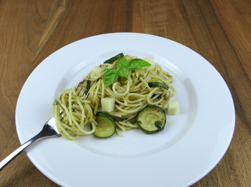 - Wenn die Spaghetti al dente gekocht und abgegossen sind, den Herd ausmachen und die Pfanne zurück auf die warme Platte stellen. Nun die Zucchini, Parmesan, Provolone und Basilikum dazugeben und alles gut mischen. Mit Salz und Pfeffer abschmecken und servieren.