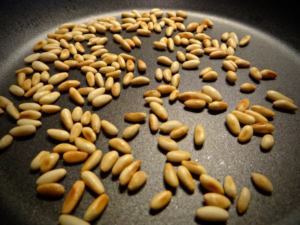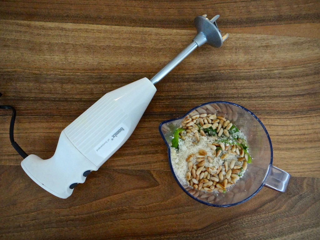 - Olivenöl, Parmesan, Pinienkerne, Zitronensaft, Salz und Pfeffer dazugeben und mit dem Stabmixer pürieren. Evtl. mit etwas Wasser verdünnen.